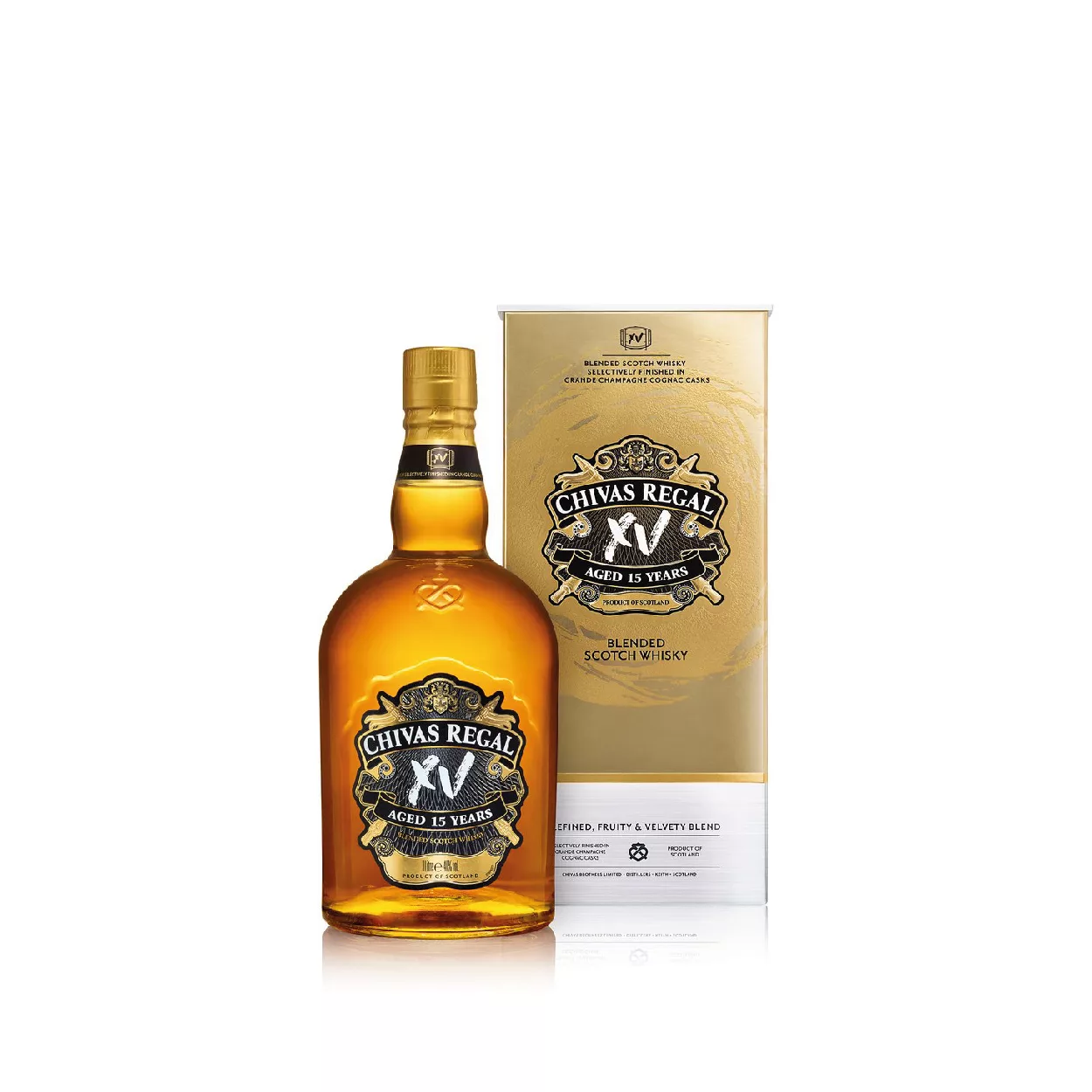 Chivas XV se añeja en las barricas de Grande Champagne Cognac más valiosas. El whisky que se obtiene tiene un cálido color ámbar y está repleto de notas de pasas sultanas con toques de canela. Lujoso, único y festivo, valió la pena esperar 15 años para el brindis.